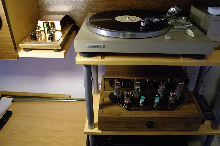 He had plenty of these around and wanted to try them out. So I sat and and made some calculations. Since we had a 300V B+ supply I had to make calculations for this supply voltage. The preamp itself is a pure classic. Two stages separated by the RIAA EQ network. The RIAA parts were calculated using this tool: