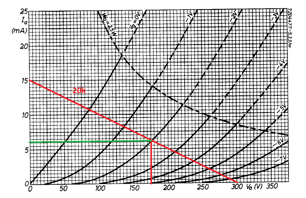 Of course before calculating the RIAA equalization network I needed to set the operating conditions of the two gain stages. Those stages are identical. Both sections are biased at 175V anode voltage, -2V grid, 6mA anode current. This setup gives about 28 of voltage gain using a 20K anode resistor. Here is the bias point:
