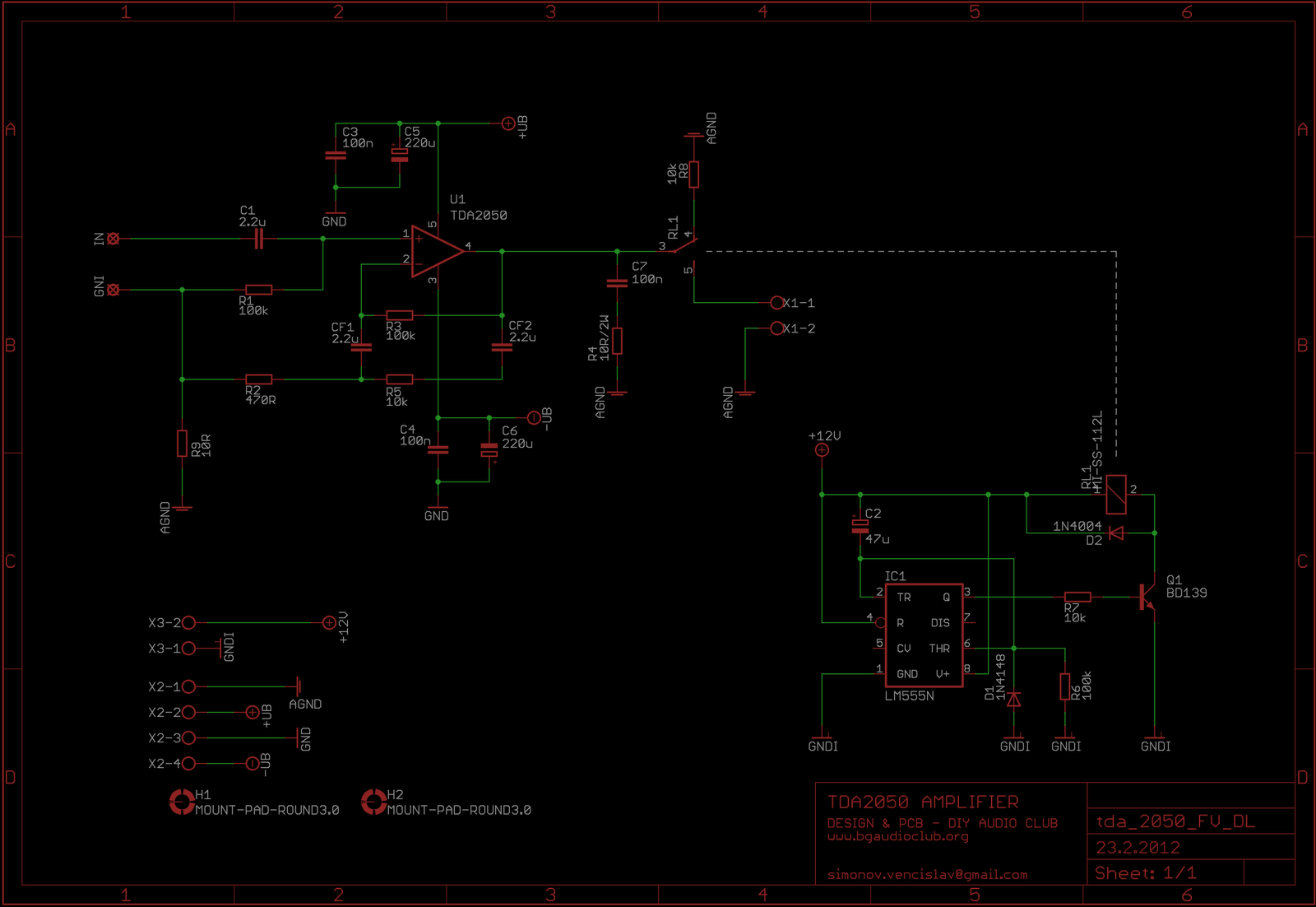 Few words about the grounding. You will notice that the signal ground and the power ground are separated. Each ground should be connected with its own ground wire directly to the center of the power capacitors. (pin1 and pin 3 of X2 terminal). The 12V supply should be coming from a separate low power transformer.